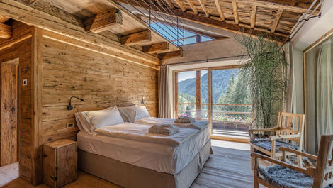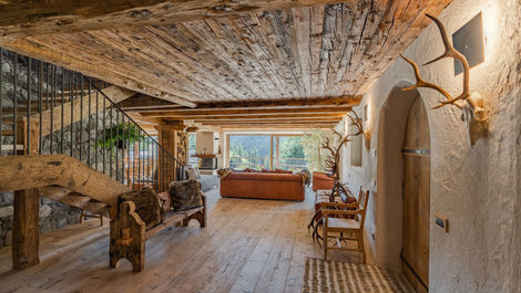 Inside, you’ll find flickering fireplaces, velvet lounges, and carved timber staircases — alongside a private wellness spa with a panoramic indoor pool, whirlpool, sauna, hammam, and stone shower. The bedrooms are individually designed with warm textures, arched ceilings, and soft mountain light pouring through thick stone-framed windows. One suite even features a hidden cinema room.